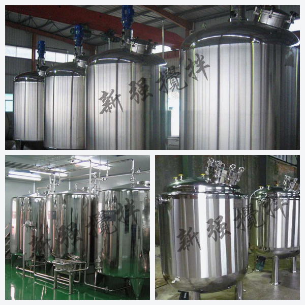不鏽鋼儲罐設備分缸體、缸蓋、進料口、出料口,均由不鏽耐酸鋼304或316制成,罐體採用立式或卧式單層或雙層結構,並根據用戶要求充填保溫材料,按GMP技術條件進行,缸體内抛光,外部採用鏡面闆或磨砂闆保溫。頂部開設進水口、回流口、消毒口、清洗口、人孔並安裝空氣呼吸器, 且可與管道連接,便於連續進各種配料,缸底爲錐度,出料口便於放料。