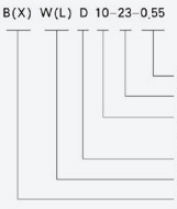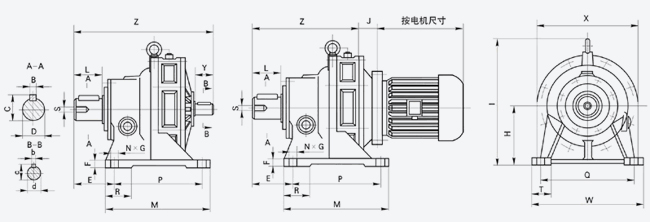 配置Y系列電動機 卧式安裝(立式安裝用L表示)。 B系列擺線針輪減速機(X系列用X表示) |