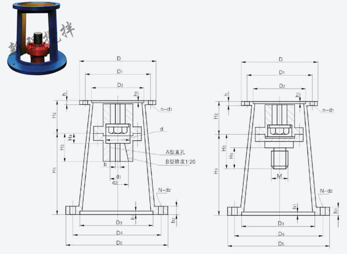 本機架适用於擺線針輪減速機的聯接,配剛性聯軸器,上聯軸器裝JA型直孔,下聯軸器裝A型直孔或B型錐孔,錐度爲1:20的聯軸器。該機架無支承适用於反應器傳來的軸向力不大時使用。