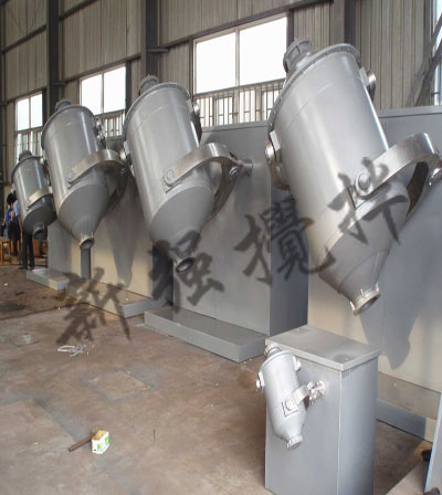 SYH系列三維運動混合機裝料的筒體在主動軸的帶動下,作周而複始的平移轉動和翻滾等複合運動,促使物料沿著筒體作環向、徑向和軸向的三向複合運動 ,從而實現多種物料的相互流動、擴散 、集聚 、參雜 、達到均勻混合的目的。