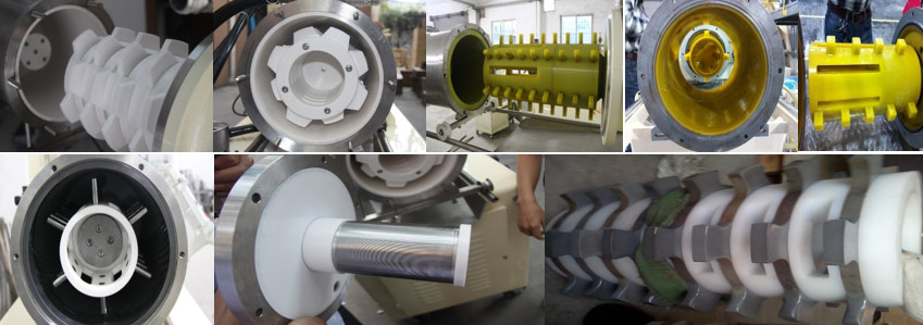 特長6 接液部可選用多種材質 可以根據用戶的要求,定制材質方案。 出料面積大,是盤式和渦輪式機器的2-4倍,物料通過性好,不易堵塞機器,在生産有膨脹性物料時優點突出。冷卻換熱效果好。桶體,轉子,出料器三位冷卻,冷卻面積是盤式及渦輪式設備的1.3-1.5倍,有效控制物料的升溫問題。