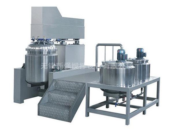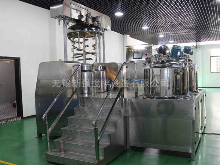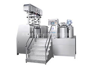 工作原理 物料在水鍋、油鍋内通過加熱、攪拌進行混合反應後,由真空泵吸入乳化鍋,通過乳化鍋内上部的中心攪拌、聚四氟乙烯刮闆始終迎合攪拌鍋形體,掃淨挂壁粘料,使被刮取的物料不斷産生新界面,再經過葉片的剪斷、壓縮、折疊,使其攪拌、混合而向下流往鍋體下方的均質器處,物料再通過高速旋轉的切割輪與固定的切割套之間所産生的強力的剪斷、沖擊、亂流等過程,物料在剪切縫中被切割,迅速破碎成200um-0.2um的微粒,由於乳化鍋内處於真空狀态,物料在攪拌過程中産生的氣泡被及時抽走。採用抽真空的方式,使所生産的制品在攪拌過程中不再混入氣泡,從而保證可制造出富有光澤、細膩及延展性良好的産品。