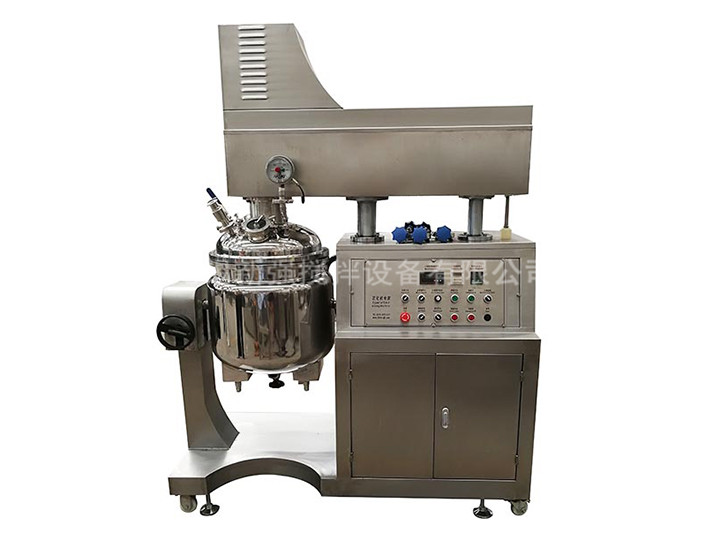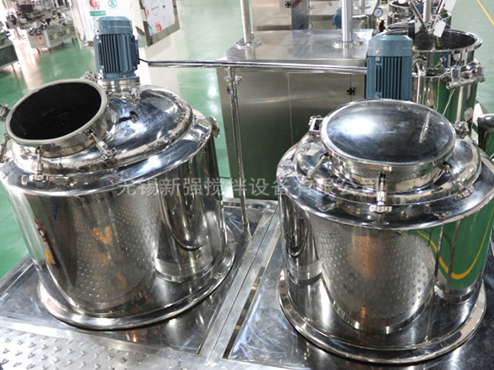 産品介紹 真空均質乳化機組由乳化鍋(可升降式鍋蓋,翻轉式鍋體)、水相鍋、油相鍋、真空裝置、加熱及溫度控制系統、冷卻系統、電器控制系統等組成。物料在乳化機的均質鍋内通過鍋内攪拌框上的聚四氟乙烯刮闆(刮闆迎合鍋體内壁,掃淨挂壁粘料),不斷産生新界面,再經過框式攪拌器及與其反向的攪拌葉,将物料剪斷、壓縮、折疊,使其攪拌、混合而向下流往鍋體下方的均質器處,再通過高速旋轉的轉子與定子之間所産生的剪斷、沖擊、亂流等過程使物料在剪切縫中被切割,迅速破碎成200nm~2μm的微粒。物料微粒化、乳化、混合、調勻、分散等可於短時間内完成。由於均質鍋内處於真空狀态,物料在攪拌過程中産生的氣泡被及時抽走,實驗室乳化機均質結束後升高鍋蓋,按下傾倒按鈕開關可使鍋内物料排向鍋外容器内(或者打開鍋底閥及加壓閥門直接排料)。 主要是指物料在真空狀态下,利用高剪切乳化器快速均勻地将一個相或多個相分布至少另一個連續相中,其利用機械帶來的強勁動能,使物料在定轉子在狹窄的間隙中,每分鍾承受幾十萬次的液力剪切。離心擠壓撞擊撕裂等綜合作用,瞬間均勻地分散乳化,經過高頻的循環往複,得到無氣泡細膩及穩定的高質量産品。 真空均質乳化機設備爲非标定制設備,根據客戶的工藝進行合理配置,适用於需要在真空狀态下乳化攪拌的産品。可帶有低速刮壁攪拌,用於高粘度産品乳化攪拌。可配置高剪切乳化機使用,适合分散、乳化、均質、攪拌混合等工藝過程。真空乳化機主要由水相鍋、油相鍋、乳化攪拌主鍋、真空系統、升降系統(可選)、電器控制系統(可選用PLC)、操作平台等組成。 鍋蓋可升降,傾倒出料,也可鍋底放料,清洗方便。通過電熱管對鍋夾層内的導熱介質進行加熱來實現對物料的加熱,加熱溫度任意設定,自動控制,均質攪拌分别具有時間設定功能操作方便。在夾層内接入冷卻液即可對物料進行冷卻,操作簡單、方便,夾層外設有保溫層。均質系統和攪拌系統可分開使用,也可同時使用。與物料接觸部分採用不鏽鋼醫用316L或者304,内表面鏡面抛光,真空攪拌裝置衛生清潔。